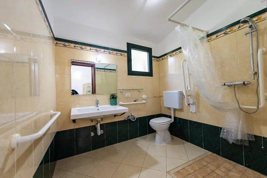 È dotata di climatizzatore con filtro antiallergico, grande bagno privato con doccia con miscelatore termostatico, divano-letto con doghe in legno, lavello, stoviglie, posate, microonde, frigo, tavolo, sedie.